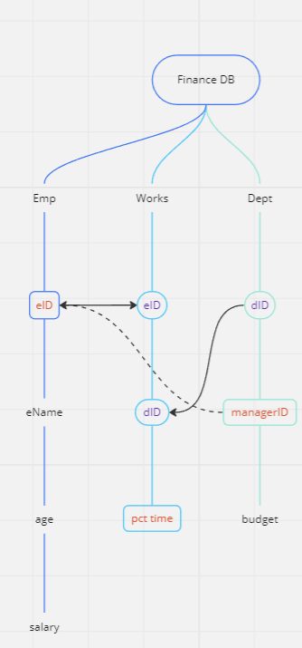 How would you go about converting this to a mind map? First, the central idea is the company itself; thus, it will become your central node. Secondly, each individual table will be its own branch, with each item having its variables as its child/sub thoughts. Third, setting up the examples involves looking at what is unique to each table, and what is shared between them: eID (employeeid) is the primary key (unique identifier) for the employee table, pct time(project time), which is the primary key for the works table, and dID (department ID) is the primary key for the departments table. However, as you can see there are multiple instances of eID and did between the three tables; these are our relationships, or formally called foreign keys.